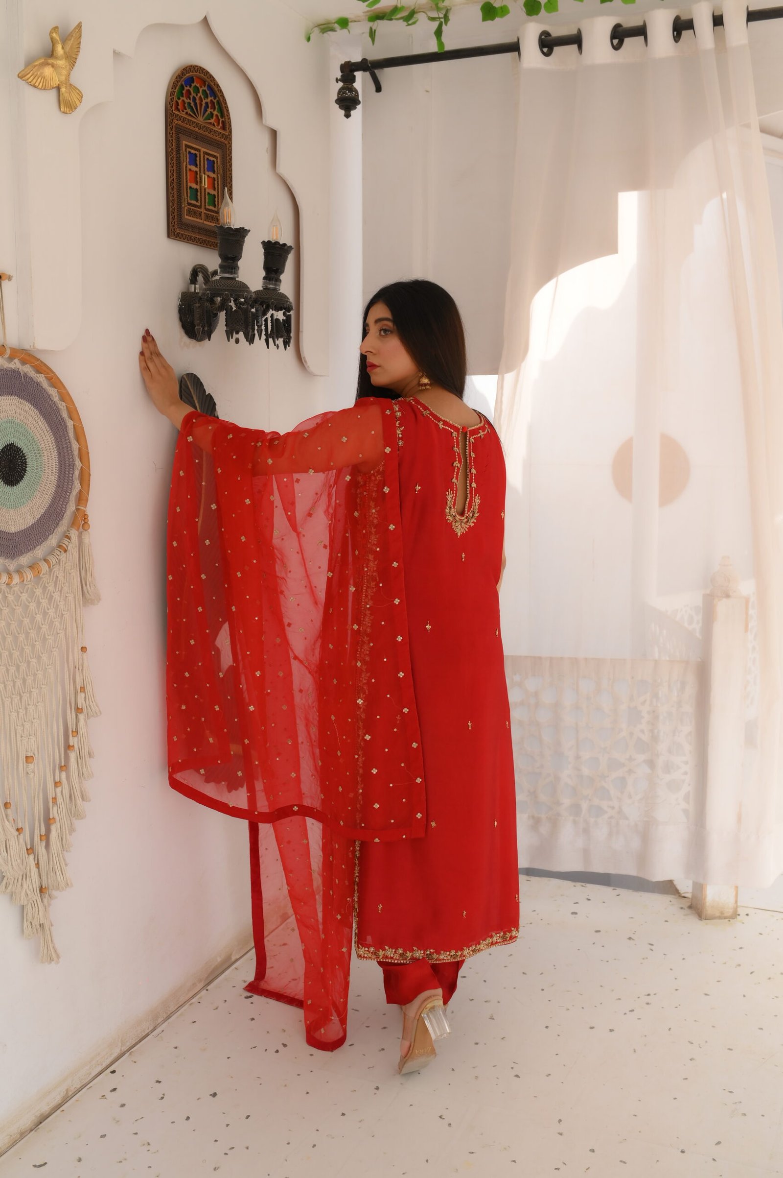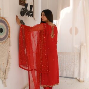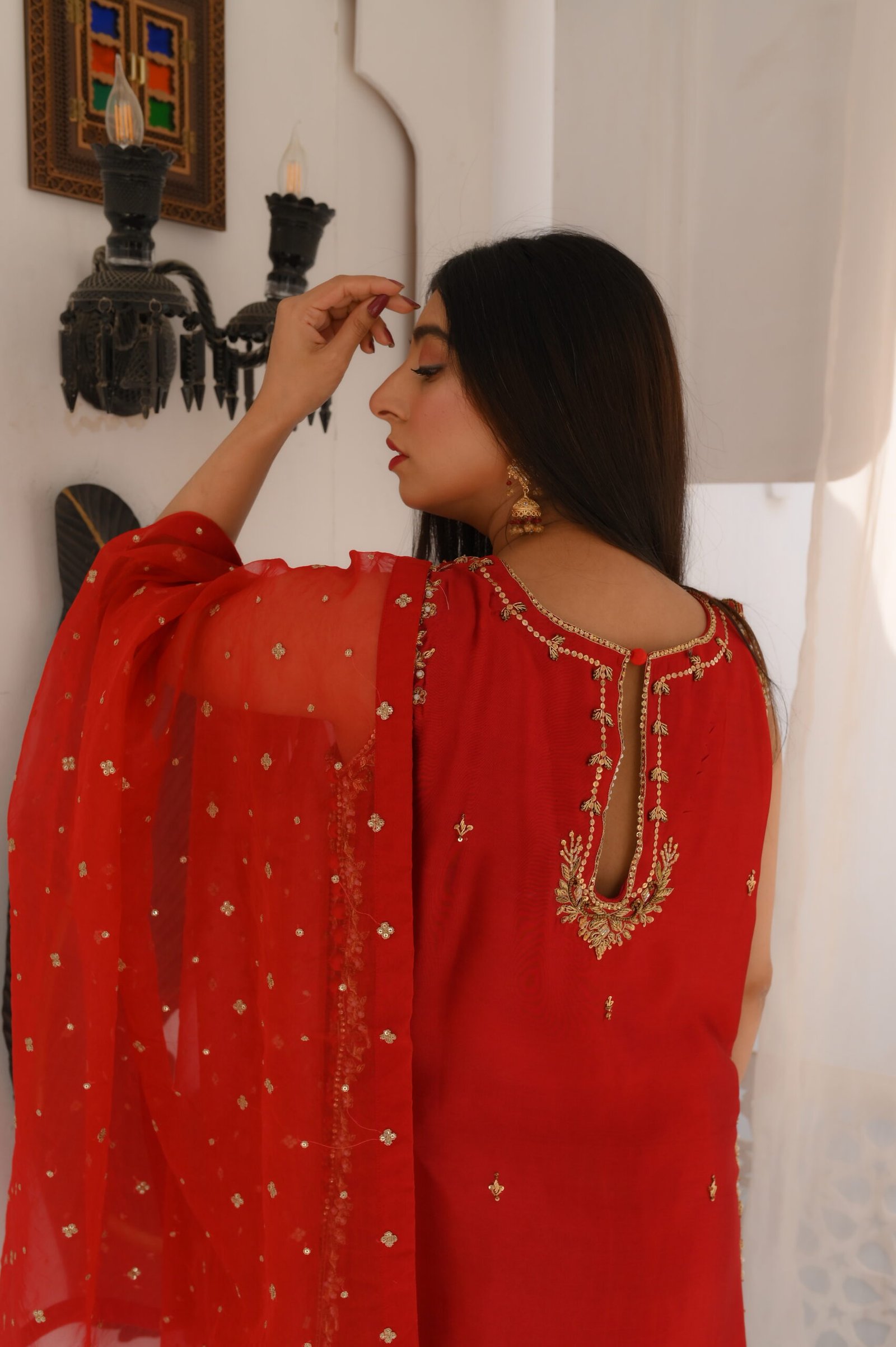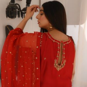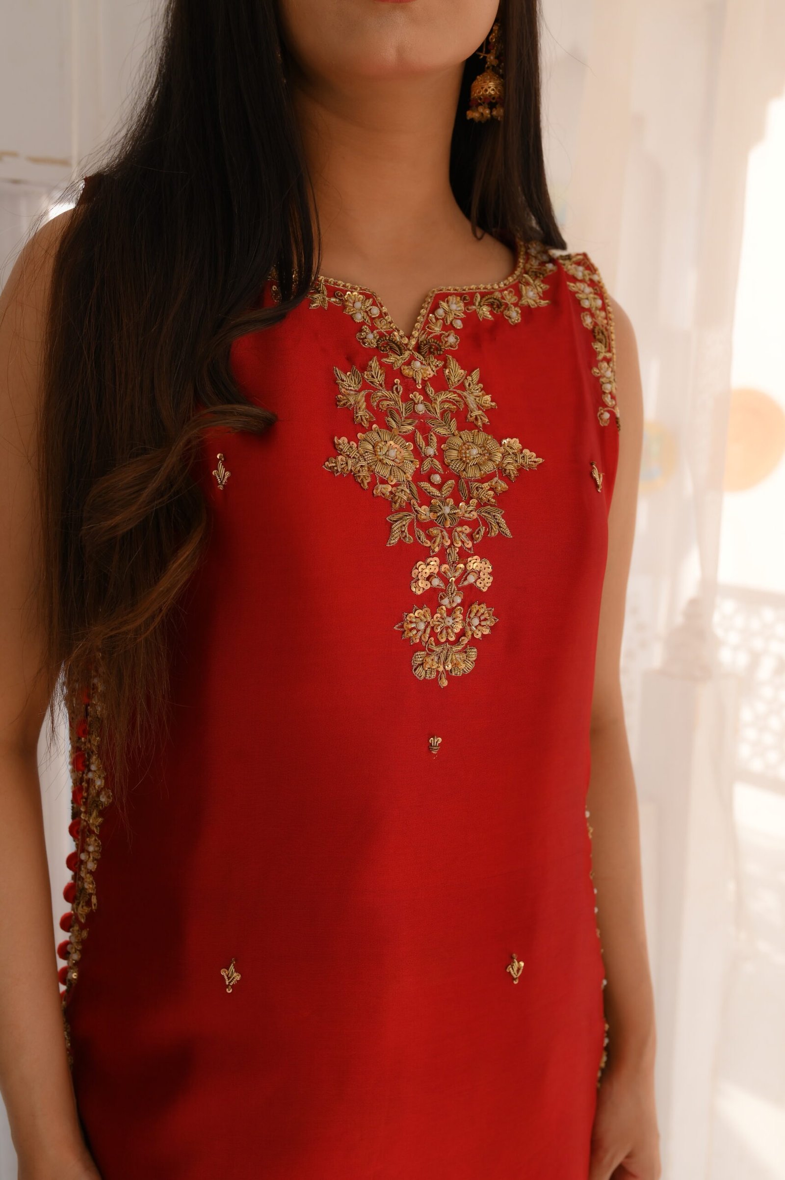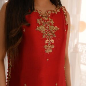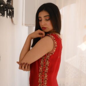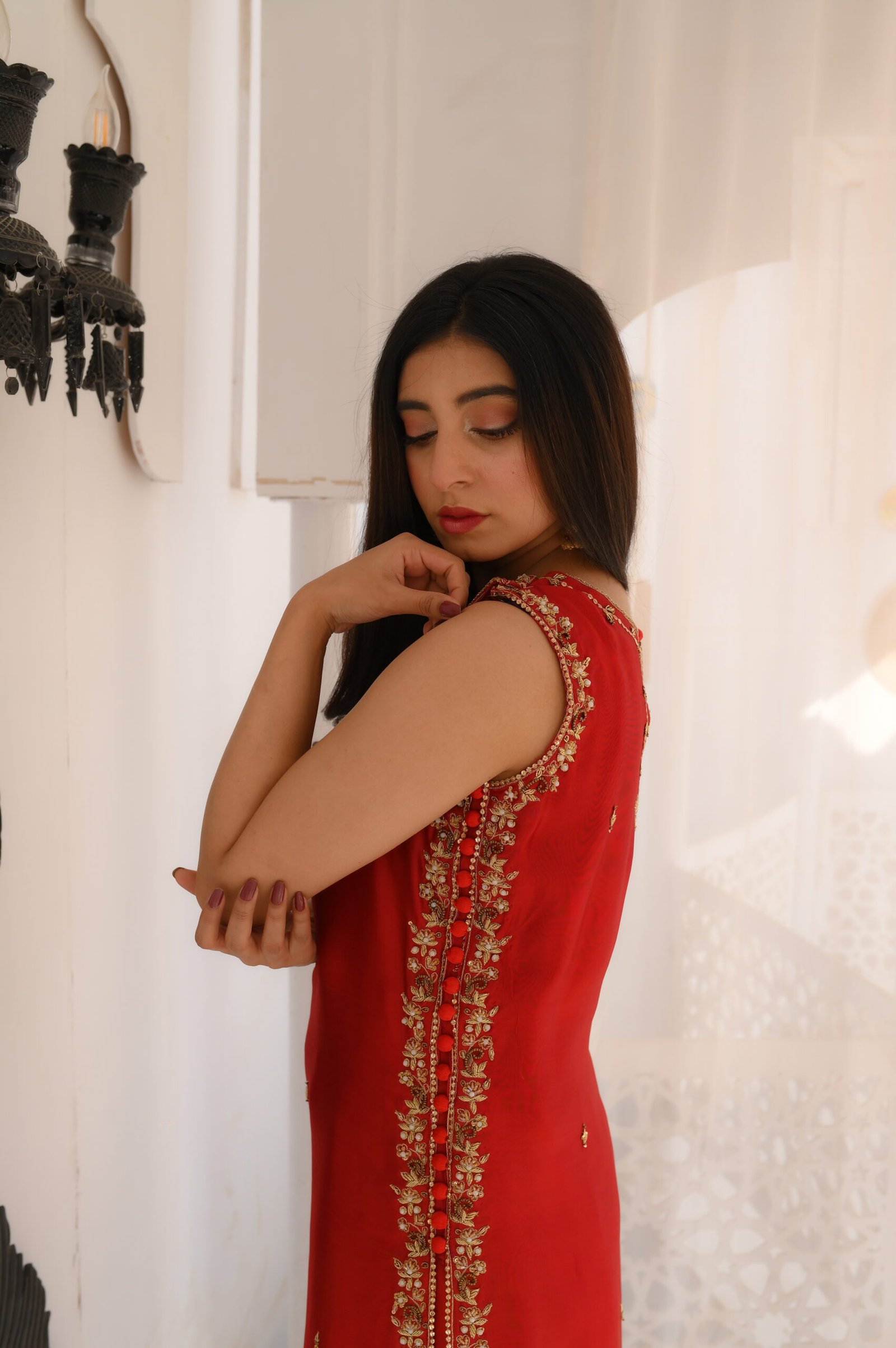 Elevate your festive wardrobe with Gulnaar, a regal deep-red ensemble crafted from luxurious Sheesha Silk. This sleeveless long silhouette features intricate handwork along the neckline, adorned with gold thread, sequins, and delicate embellishments that add a timeless festive charm. The sides are beautifully finished with detailed zardozi-inspired edging, giving the outfit an elegant, elongated look.