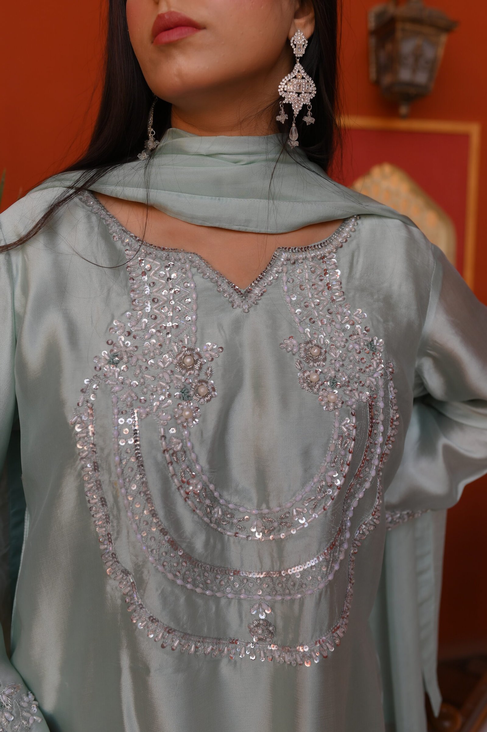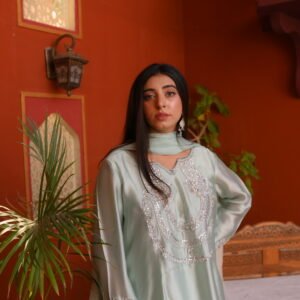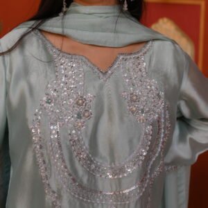 Paired with wide-leg trousers in the same soft hue and a matching lightweight dupatta, this outfit brings a fresh, serene vibe — perfect for daytime events, festive gatherings, and semi-formal occasions. Its minimal silhouette and intricate detailing make it a timeless addition to any wardrobe.