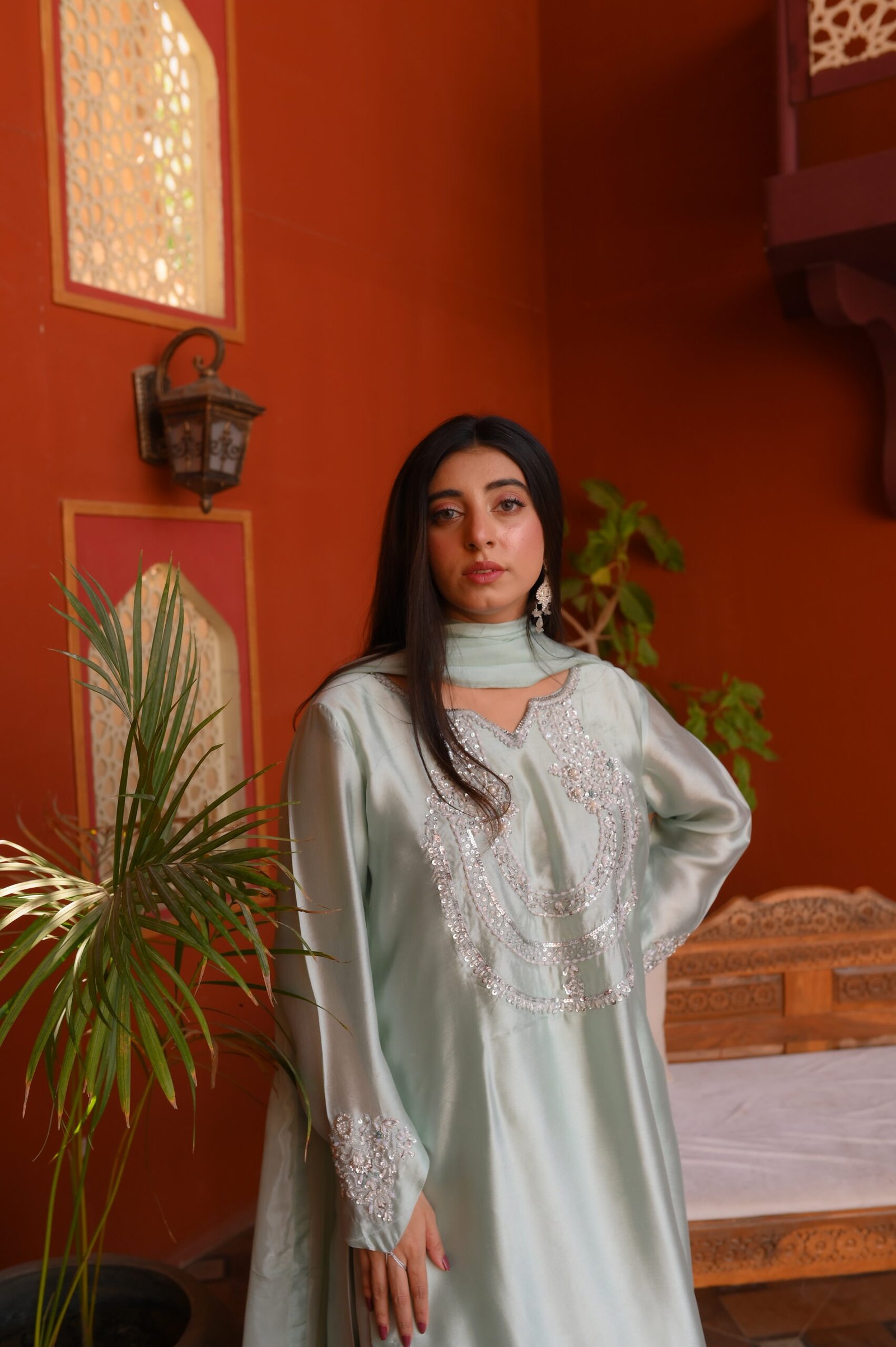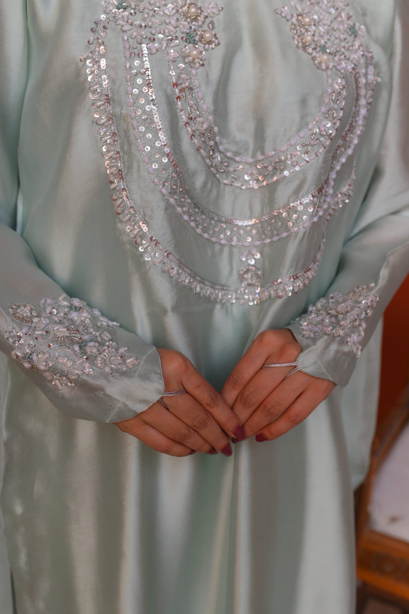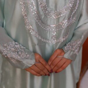 A beautifully crafted pastel mint ensemble designed for effortless elegance. The sleeveless long shirt features exquisite silver embroidery and delicate threadwork on the yoke, creating a refined and feminine look. The smooth, flowy fabric drapes gracefully, offering both comfort and style.